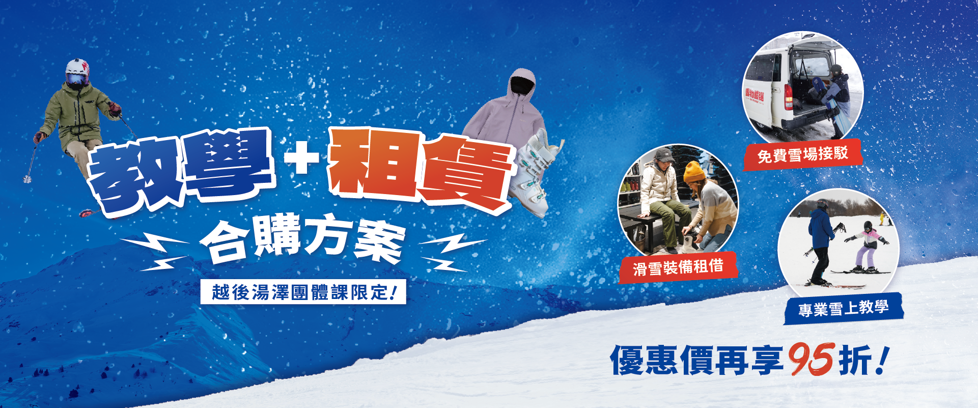 於日本越後湯澤,提供大人小孩、單雙板全套雪具裝備租賃服務,並附有雪場、旅館間的免費接駁,讓您輕鬆安排行程,享受舒適的滑雪旅程!